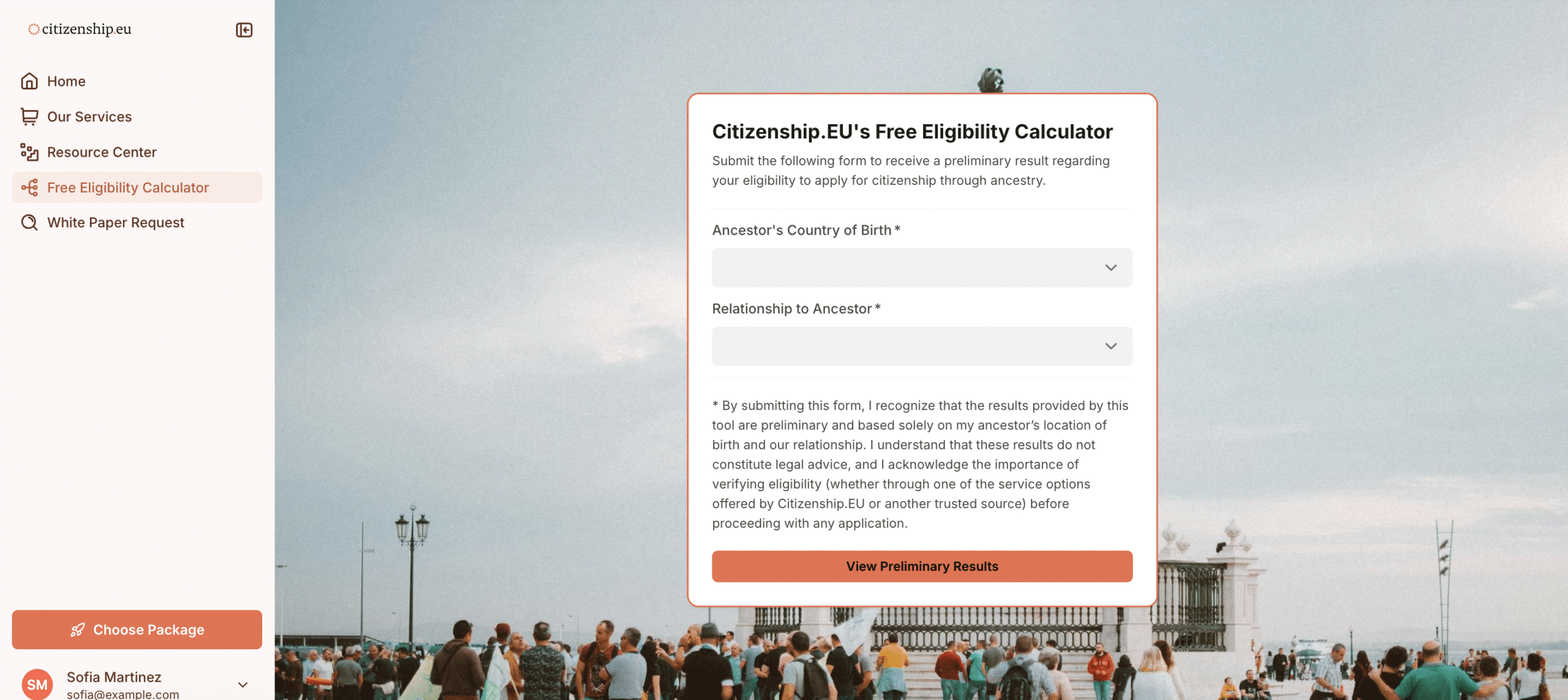That’s why we created our Free Eligibility Calculator, available through our secure client portal. By simply inputting your ancestor’s relation to you and their country of birth, you’ll receive a preliminary assessment of whether you may qualify for citizenship through a parent, grandparent, or even earlier generations.